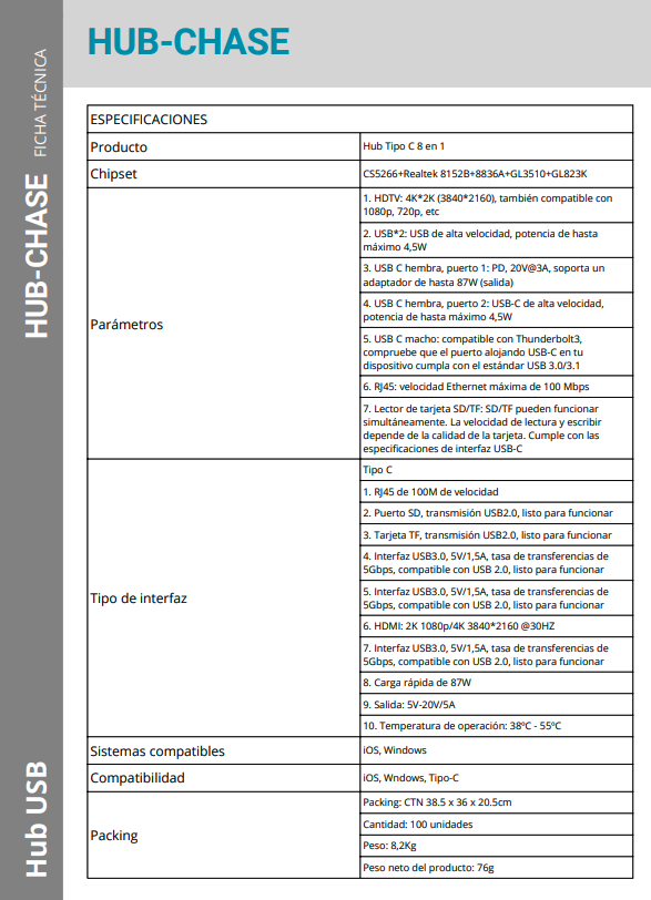 HUB-CHASE Adaptador Multifuncional8 puertos2-USB-C 1-HDMI 2-USB-AHSD/mSD RJ45-10/100