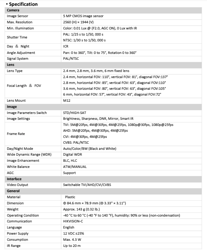 Turret TVI 5MP IR20M DS-2CE76H0T-ITPF 2.8mm (C) Hikvision Turret TVI 5MP